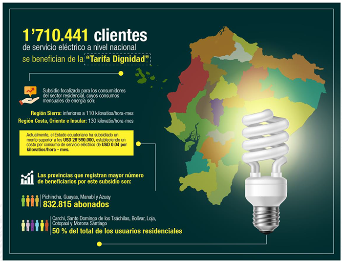 Hasta agosto de 2019, 1’710.441 clientes de servicio eléctrico a nivel nacional, equivalente al 37% del total de usuarios residenciales (unos 4’622 millones), se benefician de la Tarifa Dignidad, un subsidio focalizado cuyos consumos mensuales de energía son inferiores a 110 kilovatios/hora – mes en la zona de la Sierra y 130 kilovatio/hora – mes en las regiones: Costa, Oriente e Insular. El Ministro de Energía y Recursos Naturales No Renovables, Carlos Pérez, dijo que el Gobierno Nacional promueve políticas que benefician a quienes más lo necesitan, mediante la aplicación de tarifas focalizadas que garantizan el acceso a un servicio eléctrico de calidad. “El Estado ecuatoriano ya ha subsidiado un monto superior a los USD 28’590.000, con un costo por consumo de servicio eléctrico, dentro de esta tarifa, de USD 0.04 por kilovatios por hora, al mes”, indicó.