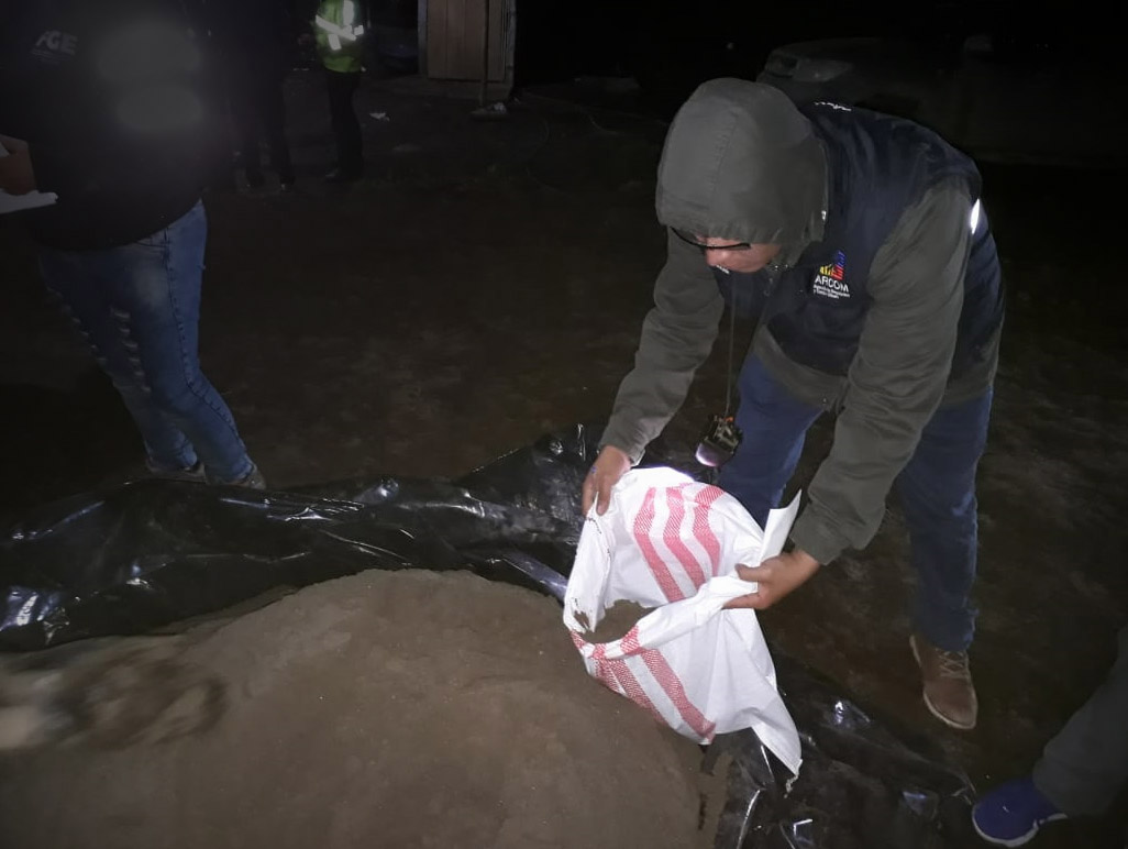 Después de los informes técnicos de peritaje emitidos por la ARCOM, la Policía Nacional incautó aproximadamente 600 sacos con material mineralizado y 36 equipos para realizar actividad minera ilegal:tres generadores a gasolina, una bomba de agua, seis motores de cilindros amalgadores, tres tanques para gas licuado de petróelo, dos palas de mano, doce secadoras de material aurífero, una barra metálica, un bulbo de nitrato de amonio, un quintal de nitrato de amonio, un rollo de manguera plásticas y un rollo de manguera de succión, una linterna, una balanza, una polea metálica, un platón metálico.