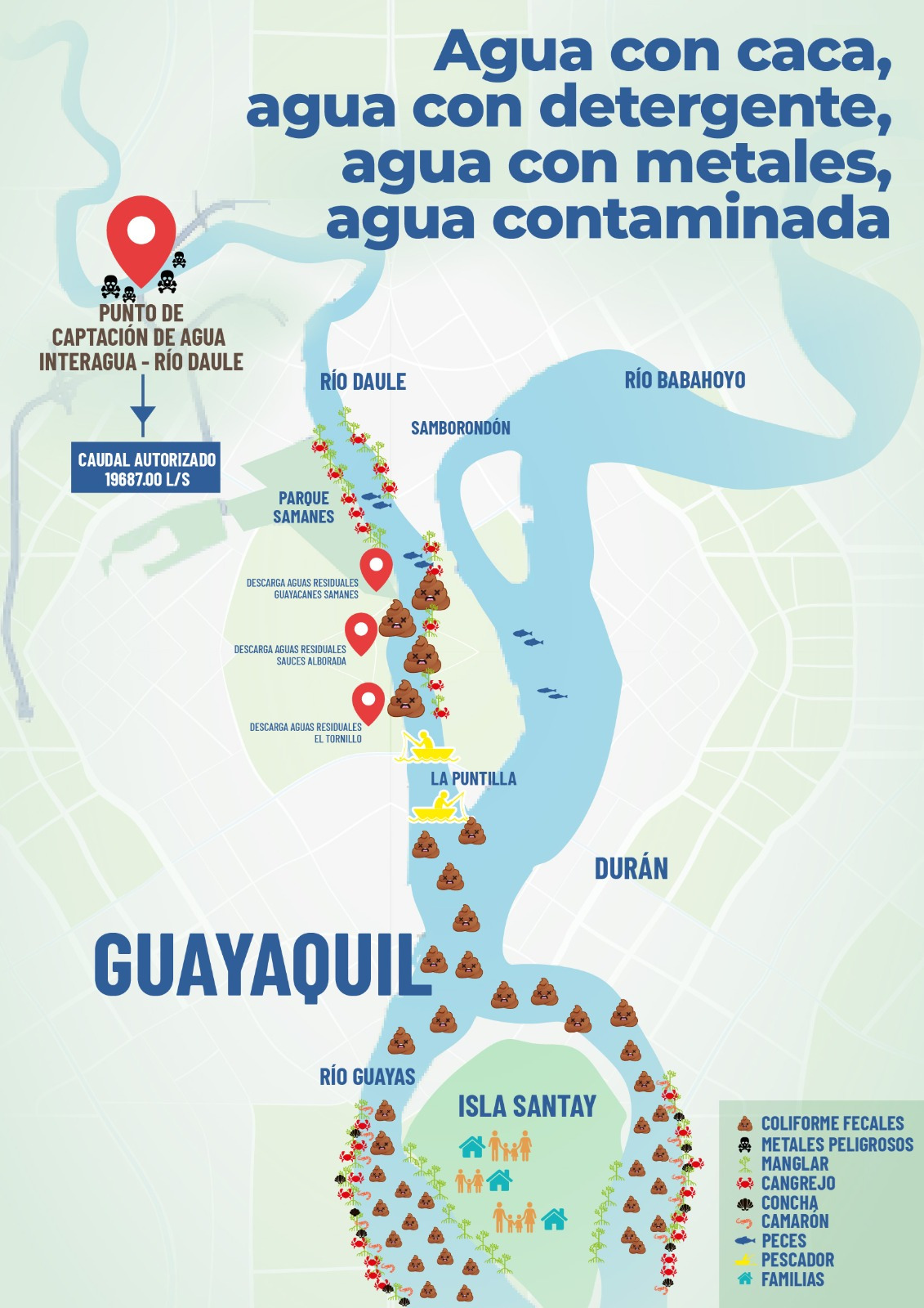 Esto se traduce a nueve años continuos (2016 – 2025) de afectación al río Daule y a la salud pública a través del agua que consumen miles de familias, la pesca artesanal, las camaroneras, los productores de concha y cangrejo, los cultivos que dependen de este cuerpo hídrico y la seguridad alimentaria de Guayaquil.