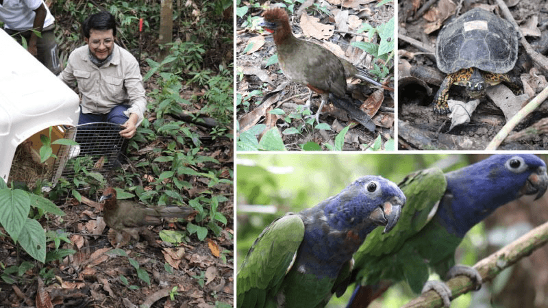 Las especies reinsertadas fueron cuatro tortugas pintadillas (Rhinoclemmys annulta), cuatro tortugas taparrabo (Kinosternon leucostomum), una tortuga mordedora (Chelydra acutirostris), tres chachalacas cabecirrufa (Ortalis erythroptera), tres loros cabeza azul (Pionus menstruus), una garza blanca (Ardea alba) y un cusumbo (Nasua).