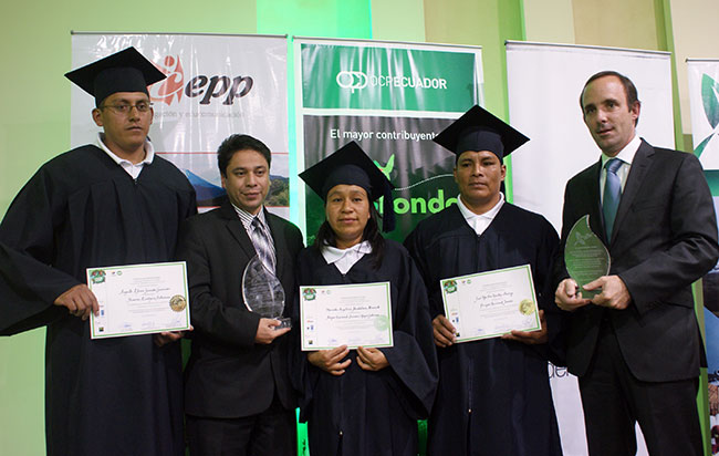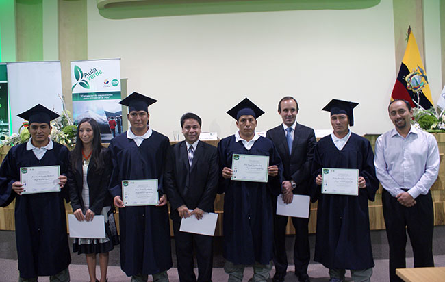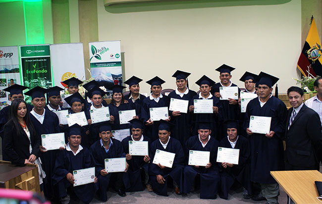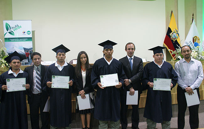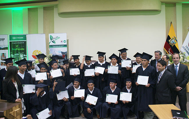 Por tal motivo hoy se realizó la graduación de la primera promoción de 23 guardaparques pertenecientes a nueve áreas protegidas de la región Amazónica, en la Escuela Politécnica Nacional, con la participación de Daniela Cruz, Coordinadora Académica Aula Verde; Andrés Mendizabal, Presidente del EcoFondo; Cristian Terán,Subsecretario de Patrimonio Natural; Francisco Prieto, Director Nacional de Biodiversidad que participarán en el acto simbólico de graduación del Programa Aula Verde.