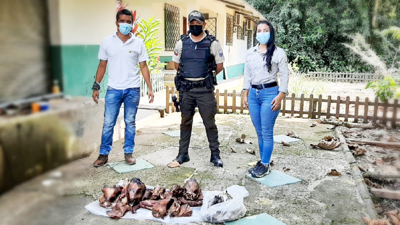 Sucumbíos.- Personal de la Reserva de Producción de Fauna Cuyabeno con el apoyo de la Policía Nacional del Ecuador – UPC Tarapoa, realizó un operativo de control en la vía Tarapoa – Lago Agrio, en el sector la Paz y Bien, con el objetivo de detener el tráfico ilegal de vida silvestre. Se retuvo un total de 45 libras de carne de saíno (Pecari tajacu) y 5 libras de pescado sin vísceras, de las especies tucunare, mojarras y boca chico.