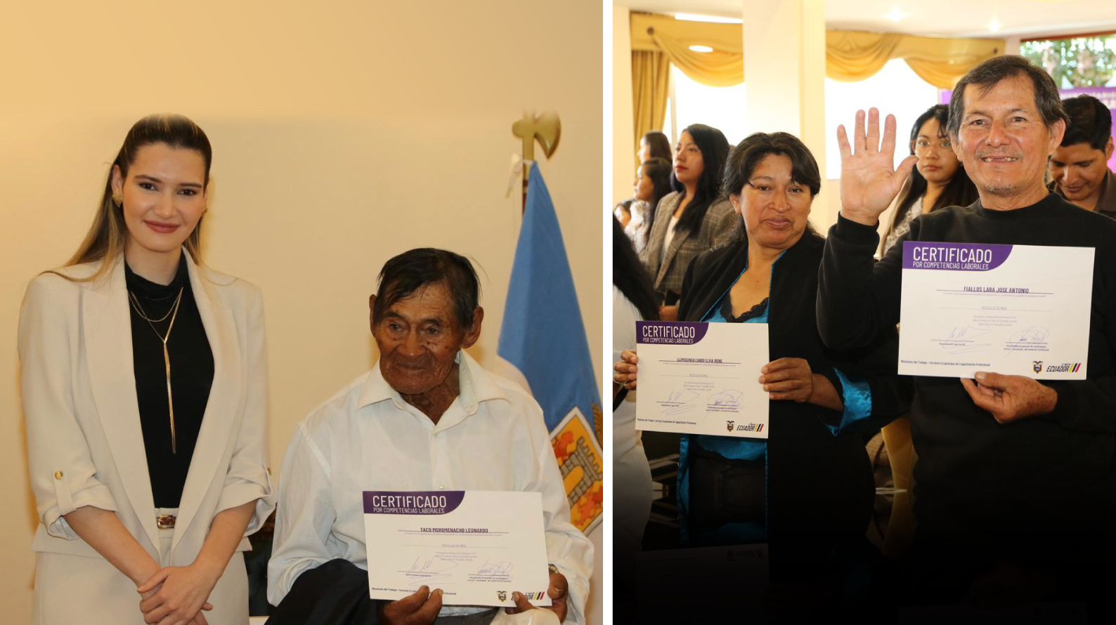 En el cantón Rumiñahui, gracias a un trabajo coordinado entre el MAATE y el GAD Municipal, en alianza con el SECAP y con el apoyo del Banco Interamericano de Desarrollo (BID), los recicladores de base recibieron, por primera vez, la certificación que les permite demostrar que están capacitados para ejercer su trabajo, conforme a los estándares requeridos en la industria del reciclaje. Además, les da acceso a oportunidades de empleo mejor remuneradas y condiciones laborales más favorables.