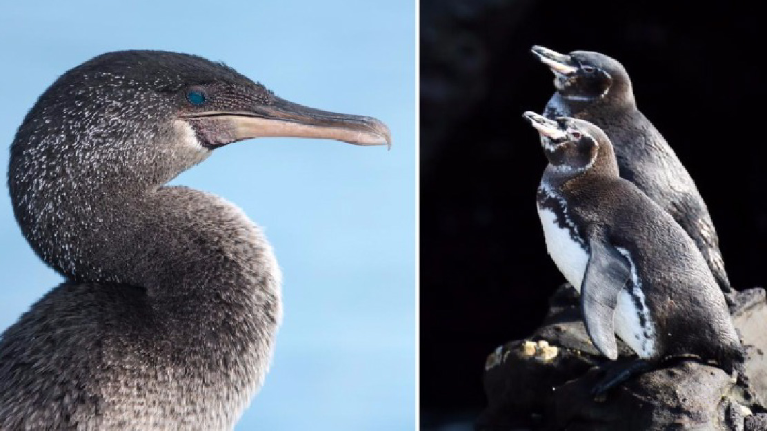El pingüino de Galápagos (Spheniscus mendiculus) es la única variedad que habita y anida sobre la línea ecuatorial y es una de las especies más pequeñas de pingüino a nivel mundial, llegando a medir hasta 35 centímetros de altura. El cormorán de Galápagos (Phalacrocorax harrisi) habita en un área muy restringida y es el único en el mundo que perdió su capacidad de volar y desarrolló habilidades para bucear; junto al pingüino están considerados como amenazados dentro de la lista roja de especies en peligro de extinción de la Unión Mundial para la Conservación de la Naturaleza (UICN).