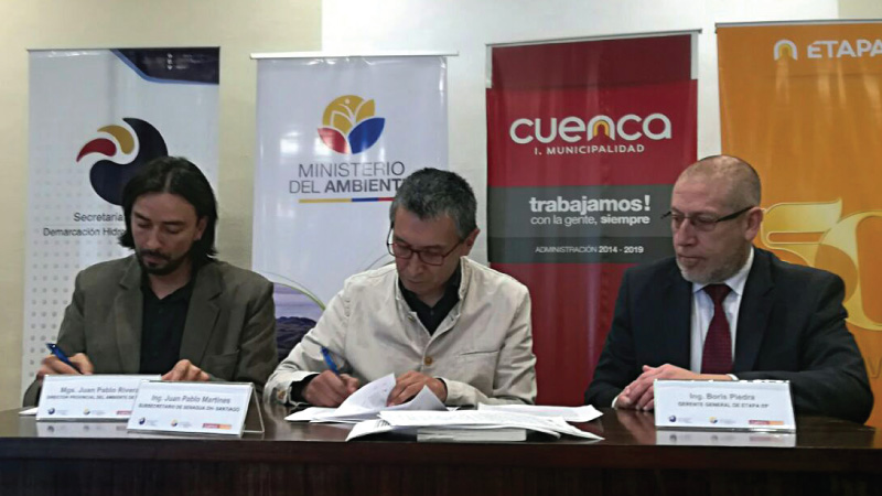 La mañana de este jueves 12 de abril de 2018, en el Museo de la Ciudad de Cuenca, se llevó a cabo la firma del convenio de cooperación interinstitucional entre el Ministerio del Ambiente, la Secretaría del Agua y la Empresa Pública Municipal de Telecomunicaciones, Agua Potable, Alcantarillado y Saneamiento de Cuenca, a fin de comprometer sus recursos humanos, técnicos y financieros para determinar y delimitar las áreas de protección para las fuentes de agua autorizadas a ETAPA EP en el cantón Cuenca, dentro de la zona de influencia de la Demarcación Hidrográfica de Santiago.