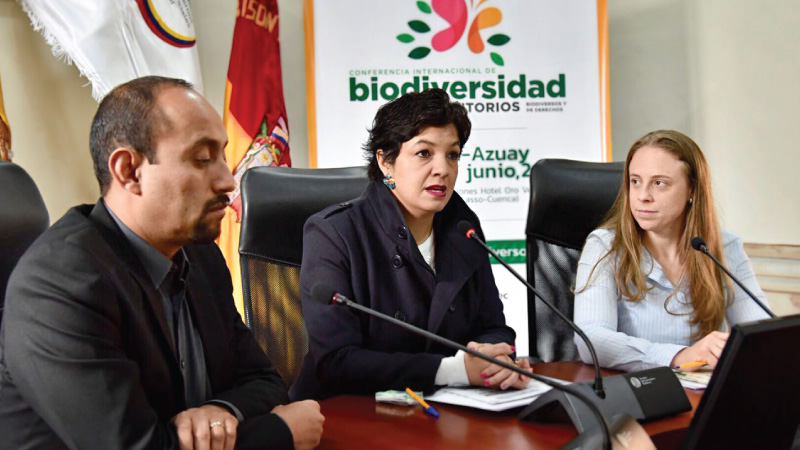 En el marco del Día Internacional de la Biodiversidad, este martes 22 de mayo, María Victoria Chiriboga viceministra del Ambiente subrogante, junto a María Cecilia Alvarado, viceprefecta del Azuay, Francisco Prieto, Subdirector del Instituto Nacional de Biodiversidad (INABIO) y el Consorcio de Gobiernos Autónomos Descentralizados del Ecuador (CONGOPE) realizaron la presentación de la Conferencia Internacional de Biodiversidad: Territorios Biodiversos y de Derechos, encuentro que se desarrollará el 21 y 22 de junio de 2018 en Cuenca.