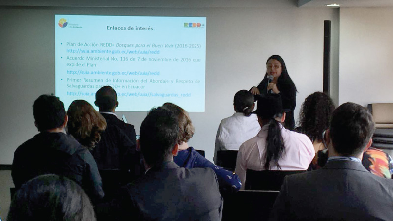 Los representantes del Ecuador expusieron los avances en el proceso de desarrollo del enfoque y alcance nacional de las salvaguardas sociales y ambientales de REDD+, así como los esfuerzos realizados para el involucramiento de actores, desarrollo del Sistema de Información de Salvaguardas y las perspectivas para la aplicación de éstas.