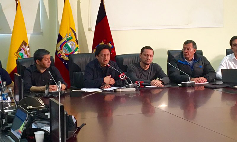 El Ministro Coordinador de Sectores Estratégicos, Rafael Poveda Bonilla, junto a los ministros de Telecomunicaciones, Augusto Espín; de Hidrocarburos (s), Xavier Rodríguez; al Gerente de Petroecuador, Pedro Merizalde y al subsecretario del Agua, Daniel Santos, presentó un informe de las acciones que cumplen las entidades de Sectores Estratégicos para garantizar la dotación los servicios eléctricos, de telecomunicaciones, hídrico e hidrocarburos, en las provincias de Esmeraldas, Manabí, Santo Domingo de Los Tsáchilas y Guayas, que resultaron afectados por sismo del sábado 16 de abril.