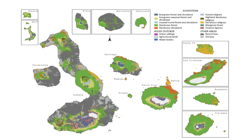 El 3.09% del área protegida de la isla Santa Cruz y el 2.88% en Isabela tienen el porcentaje más alto de vegetación dominada por especies invasivas, así lo reveló el estudio «Una metodología para mapear la cobertura vegetal nativa e invasiva en los archipiélagos: un ejemplo de las islas Galápagos», realizado por el Ministerio del Ambiente de Ecuador, a través de la Dirección del Parque Nacional Galápagos, en conjunto con la Universidad San Francisco de Quito y la Universidad de Carolina del Norte.