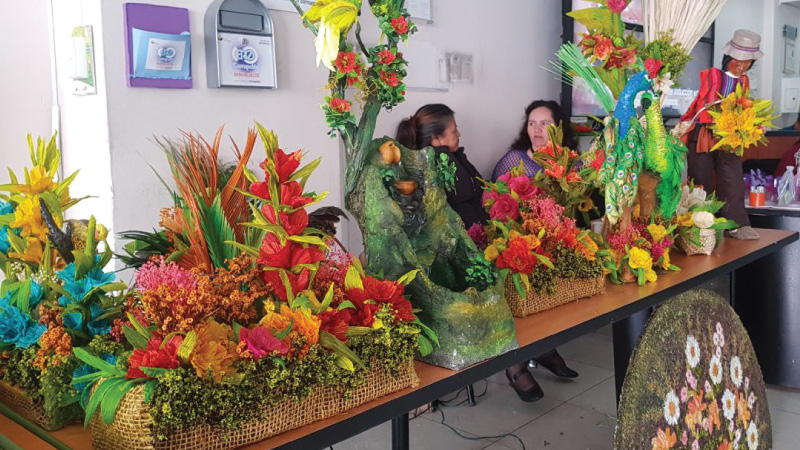 Los bioemprendedores exponen varios productos artesanales trabajados con materiales ecológico, entre ellos, ramos hechos en materiales hoja de maíz, paja toquilla cruda y procesada, flores de ilusión, palma de sica (se cultiva en Nayón), fibra de palma africana (estopa), terciopelo pirograbado y pintado, cáscaras de arveja y tela polar, todas estas alternativas en el marco de la celebración de Semana Santa.