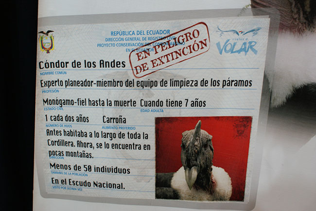En Ecuador, existen alrededor 50 especímenes de cóndor en estado silvestre y 19 en cautiverio. Esta ave, emblema de los andes, está en Peligro Crítico de Extinción, registrada dentro del Libro Rojo de Aves del Ecuador, y en el Apéndice I de la Convención sobre el Comercio Internacional de Especies Amenazadas de Fauna y Flora Silvestres (CITES), lo que significa que su comercialización está prohibida.