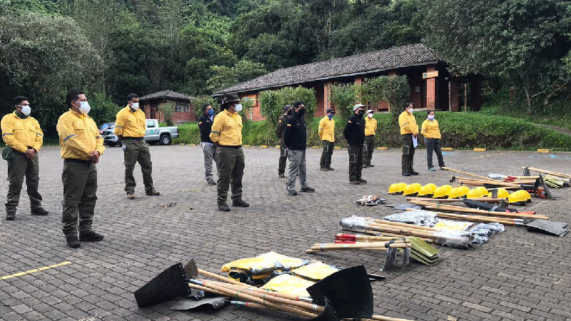 Pichincha.- En el marco de la Campaña Nacional de Prevención “No más Incendios Forestales”, que será presentada oficialmente este 06 de agosto de 2020, el Ministerio del Ambiente y Agua entregó 160 herramientas para la prevención de incendios forestales en las áreas protegidas. El equipamiento que incluye uniformes, cascos, cortafuegos, machetes, palas y picos fueron recibidos por guardaparques de la Reserva Geobotánica Pululahua, Refugio de Vida Silvestre Pasochoa, Reserva Ecológica Los Illinizas y Área Nacional de Recreación el Boliche.