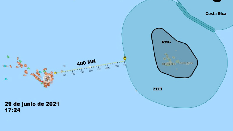 El navío se encuentra en aguas internacionales, a aproximadamente 300 millas náuticas de la Zona Económica Exclusiva Insular Ecuatoriana y a unas 470 millas náuticas de la Reserva Marina de Galápagos.