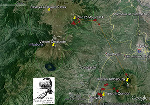Los reportes del día 23 indican que se encontraba cerca del Cerro Imbabura, parte occidental, mientras que para el día 25 se revela que el cóndor está en los alrededores del Cerro Cotacachi, dentro de la Reserva Ecológica Cotacachi Cayapas (RECC).