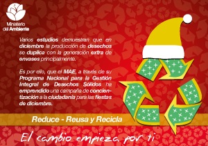 El Ministerio del Ambiente, a través de su Programa Nacional para la Gestión Integral de Desechos Sólidos (PNGIDS) emprende una campaña de reducción, reuso y reciclaje de residuos sólidos a propósito de las fiestas de diciembre.