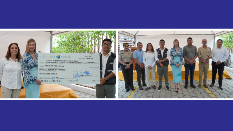 • USD 30.000 – Agencia de Regulación y Control de la Bioseguridad y Cuarentena para Galápagos, para el diseño de un filtro de inspección cuarentenaria a ser implementado en los muelles de las islas Floreana e Isabela; así como para el fortalecimiento de la brigada canina de la institución, en la isla Santa Cruz, mediante la compra de un perro k9 y la adquisición de insumos para campañas de control de plagas.