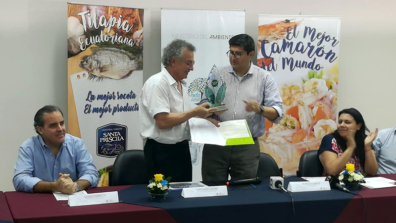 El Ministro del Ambiente, Marcelo Mata Guerrero, este 28 de enero, realizó la entrega de la Certificación Ecuatoriana Ambiental Punto Verde a la Planta Acuícola de Chanduy de la empresa Industrial Pesquera Santa Priscila, en la provincia de Santa Elena, por la reducción del 14% en el consumo de diésel por el cambio de bombas y motores en la estación de bombeo.