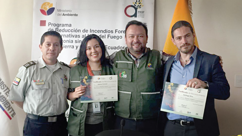 En reconocimiento al compromiso y dedicación de guarparques, al Grupo Táctico Forestal del Cuerpo de Bomberos del DMQ y responsables de esta labor, el Ministerio del Ambiente, entregó a personal de la Reserva Ecológica Cotacachi Cayapas, Parque Nacional Cotopaxi, Reserva Manglares Churute, Dirección Provincial de Ambiente de Pichincha, menciones honoríficas por su esfuerzo y sacrificio en la prevención de los incendios.