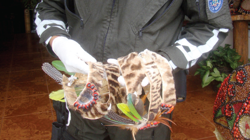En el cantón Loreto (Orellana) se realizó un operativo de control de vida silvestre entre personal del Ministerio del Ambiente y la Unidad de Protección del Medio Ambiente, de la Policía Nacional, que dejó como resultado la retención y decomiso de: ocho coronas elaboradas con piel de tigrillo (Leopardus sp.), una corona elaborada con piel de venado colorado, un cráneo de venado colorado (Mazama americana) y un cráneo de tigrillo (Leopardus sp.).