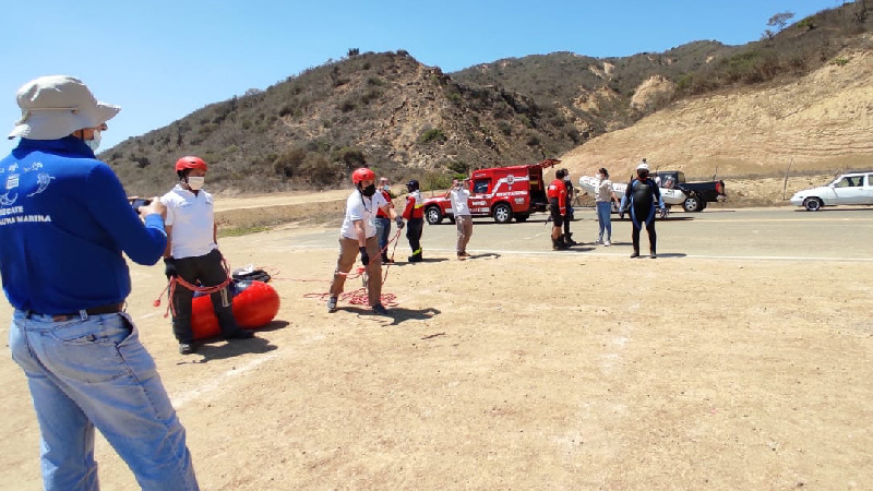 Manabí.- El Ministerio del Ambiente, Agua y Transición Ecológica, capacitó a 21 personas entre guardaparques del Refugio de Vida Silvestre Marino Costera Pacoche y El Parque Nacional Machalilla, Cuerpo de Bomberos de Manta, Policía Nacional, Fundación Contamos Contigo Ecuador y Salvavidas de San Lorenzo, en el primer taller de “Entrenamiento de megafauna enredada en el mar”, actividad desarrollada en el cantón Manta.