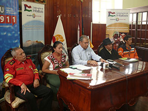 Diego García, Gobernador de Imbabura; Segundo Fuentes, Coordinador Zonal 1 del MAE; Verónica Chicaiza, Subdirectora Zonal del ECU 9-11; Marco Hadathy, jefe del Cuerpo de Bomberos de Imbabura y Diego Torres, representante de la Secretaría Nacional de Gestión de Riesgos; presidieron el acto oficial, en el que se socializó el Plan de Contingencia de Control de Incendios, con el fin de implementar medidas que permitan prevenir, mitigar y controlar los incendios que se agudizan en época de verano en todo el país, causando perjuicios a nivel social, económico y ambiental.