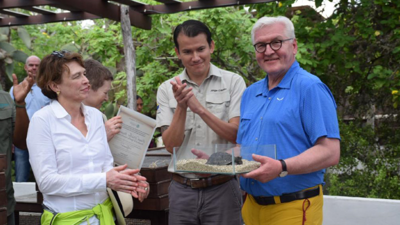 La delegación del país germano pudo conocer el Centro de Crianza de Tortugas Gigantes, en Santa Cruz, donde el Presidente alemán se convirtió en padrino oficial de la primera tortuga nacida en 2018, de la especie Chelonoidis donfaustoi, a la que bautizó con el nombre de “Alejandra”.