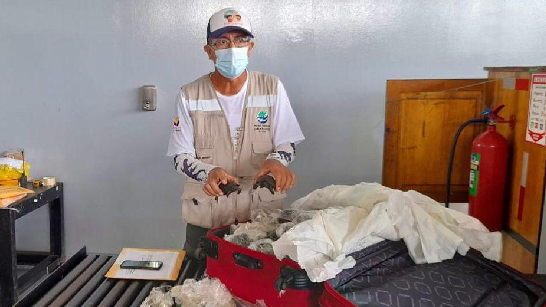 El 28 de marzo de este año durante las actividades de revisión de carga en el aeropuerto de Baltra, guardaparques de la Dirección del Parque Nacional Galápagos, junto al personal del aeropuerto ecológico Galápagos hicieron el hallazgo de 185 tortugas gigantes de Galápagos (neonatos), dentro de una maleta que saldría hacia Guayaquil en uno de los vuelos, hecho que fue frustrado gracias al trabajo de control que efectúan los guardaparques con la empresa ECOGAL. D/A