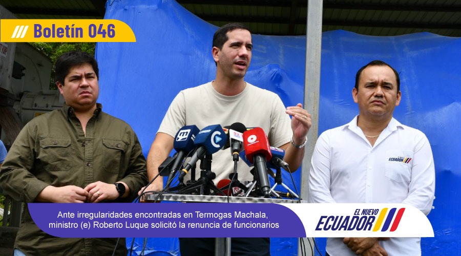 El ministro de Energía y Minas ( e ) Roberto Luque realizó un reconocimiento en la Central Termogas Machala ubicada en la provincia de El Oro, donde se llevó a cabo la sexta rueda de prensa con medios de comunicación. En el conversatorio, la autoridad solicitó la renuncia de los funcionarios involucrados debido a las irregularidades encontradas durante la visita.