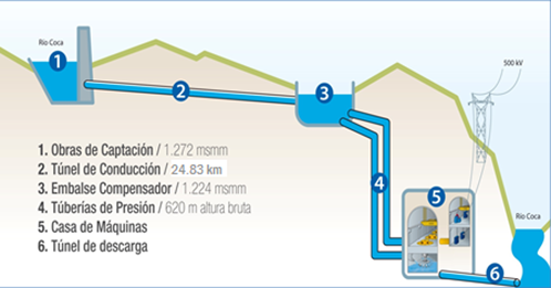 Central que aprovecha el potencial de los ríos Quijos y Salado que forman el río Coca, en una zona en la que este río describe una curva en la que se presenta un desnivel de 620 m, con un caudal medio anual de 287 m3/s para su generación hidroeléctrica.