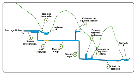 Sopladora está conformada por una conexión directa entre los túneles de descarga de la Central Molino y el sistema de carga de la Central Sopladora. La conexión directa consta de un túnel de derivación de flujo que comunica con dos túneles de descarga hacia una cámara de interconexión subterránea que proveerá el volumen necesario para garantizar el ingreso de 150 m3/seg para el funcionamiento del sistema de generación que consta de tres 3 turbinas Francis de 165.24 MW, alojadas en la casa de máquinas subterránea.
