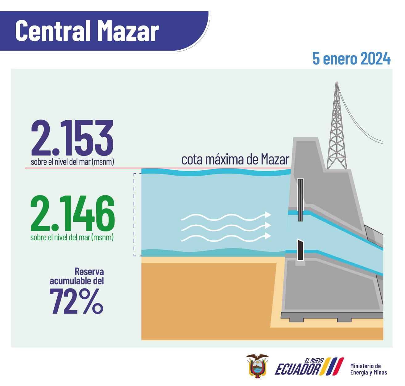 Este 5 de enero, la cota de la represa Mazar registró una cifra de 2.146 metros sobre el nivel del mar (msnm) con una reserva del 72%. Esta situación favorable garantizará el abastecimiento de energía eléctrica al país, ante la suspensión de operaciones de la Central Coca Codo Sinclair que entrará en mantenimiento los días 6 y 7 de enero de 2024. Cabe señalar que la cota máxima de Mazar es de 2.153 msnm.