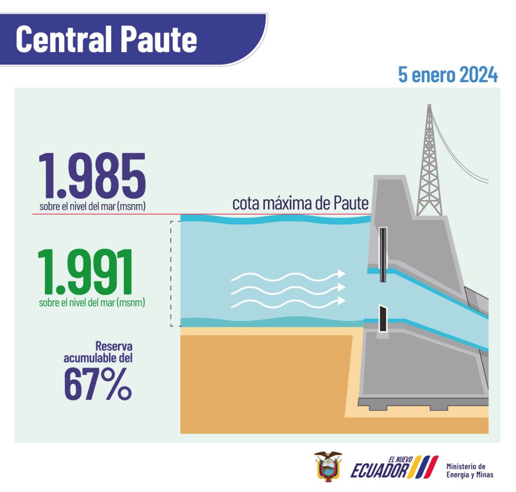 La considerable recuperación de los niveles de los embalses también se evidenció en la Central Paute, cuyo nivel ascendió a 1.985.4, el máximo es de 1.991 msnm. Este parámetro representa el 67% de la reserva máxima acumulable en esta hidroeléctrica.