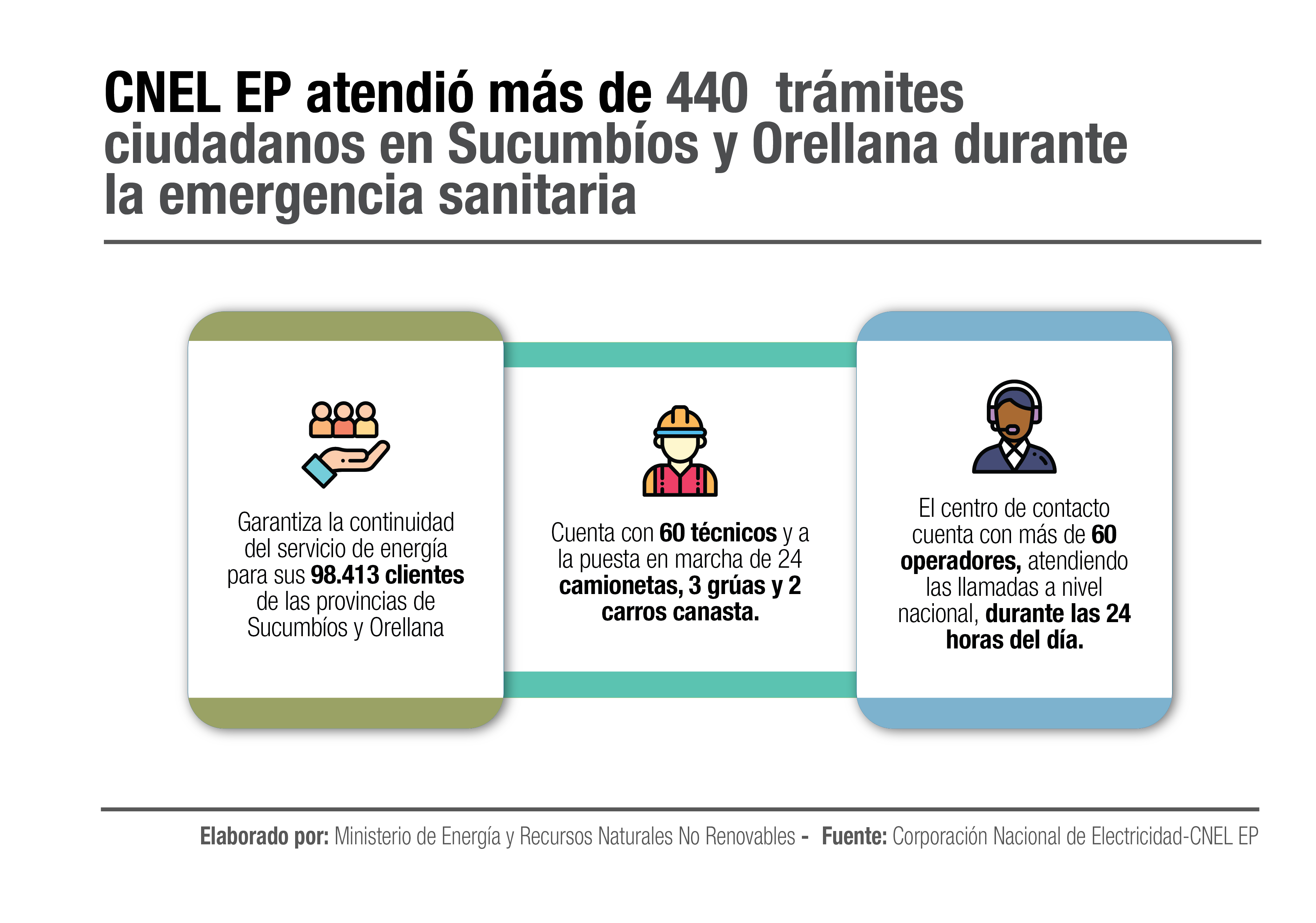 Frente a la Emergencia Sanitaria, vigente en Ecuador por la propagación del Covid – 19, la Corporación Nacional de Electricidad -CNEL EP-, a través de su Unidad de Negocio Sucumbíos, garantiza la continuidad del servicio de energía para sus 98.413 clientes y la ciudadanía en general de las provincias de Sucumbíos y Orellana, en la región amazónica ecuatoriana.
