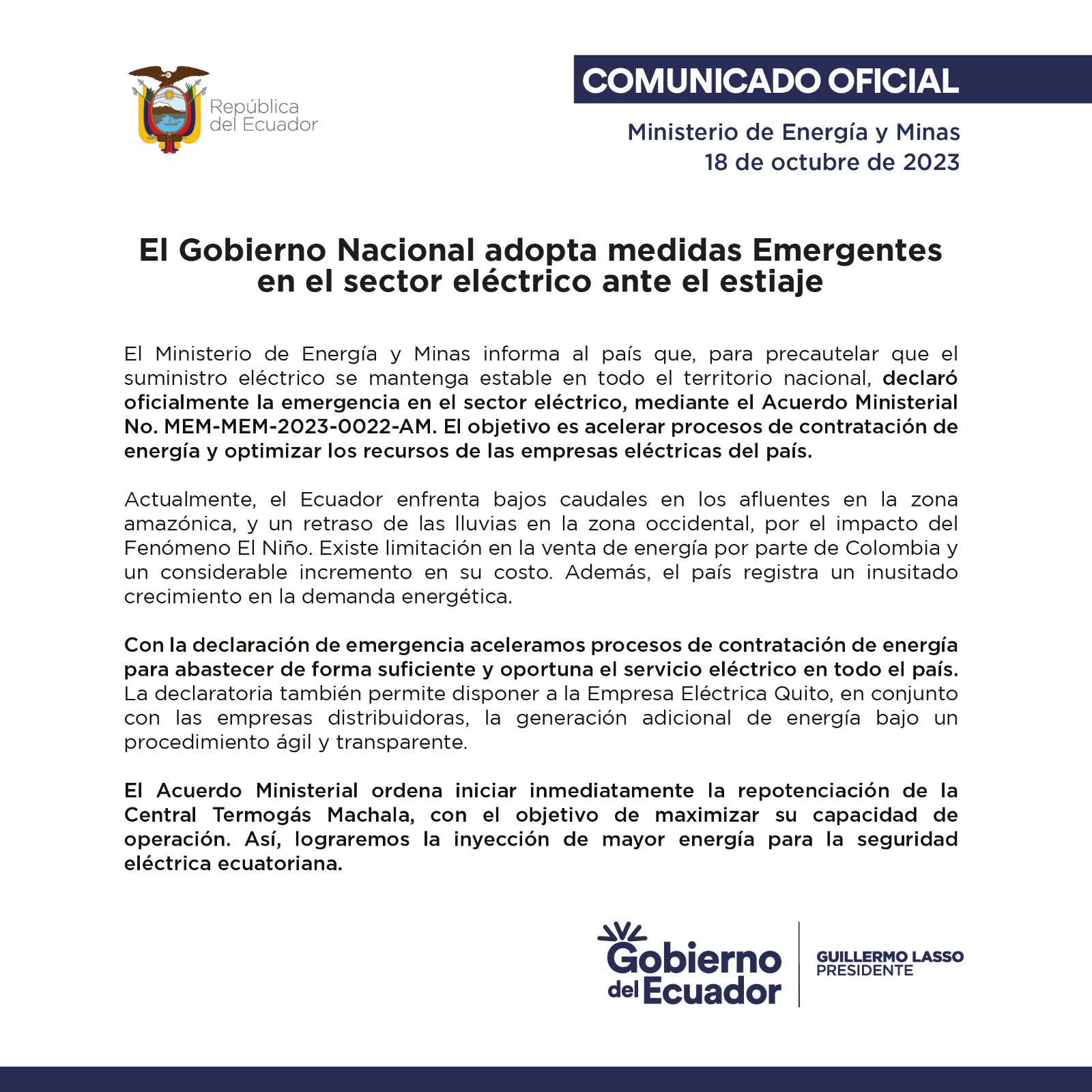 Comunicado Oficial: Emergencia Sector Eléctrico