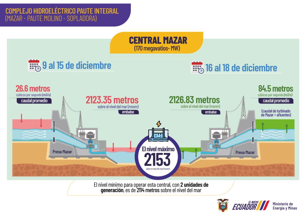 A pesar del incremento en los caudales de los ríos que alimentan el complejo Paute Integral (centrales Mazar, Paute Molino y Sopladora) y el nivel del caudal de Coca Codo, los cortes de energía programados para diciembre continuarán para que las reservas hídricas no disminuyan y así prever el mantenimiento de la central Coca Codo Sinclair, el próximo año.