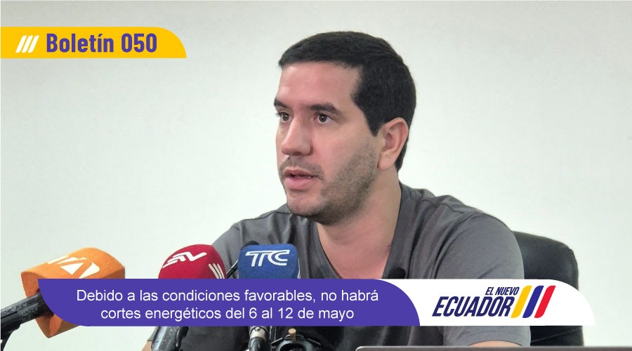 “La alta precipitación de lluvias en Azuay ha mejorado el caudal en Mazar, y hemos observado el impacto positivo de la compra de energía a Colombia que sumando a la incorporación al sistema de generación nacional de 156 megavatios adicionales provenientes del mantenimiento del parque térmico nos permite indicar que esta semana no habrá cortes eléctricos» advirtió el ministro de Energía y Minas encargado, durante su décima rueda de prensa desde el Gobierno Zonal de Guayaquil.