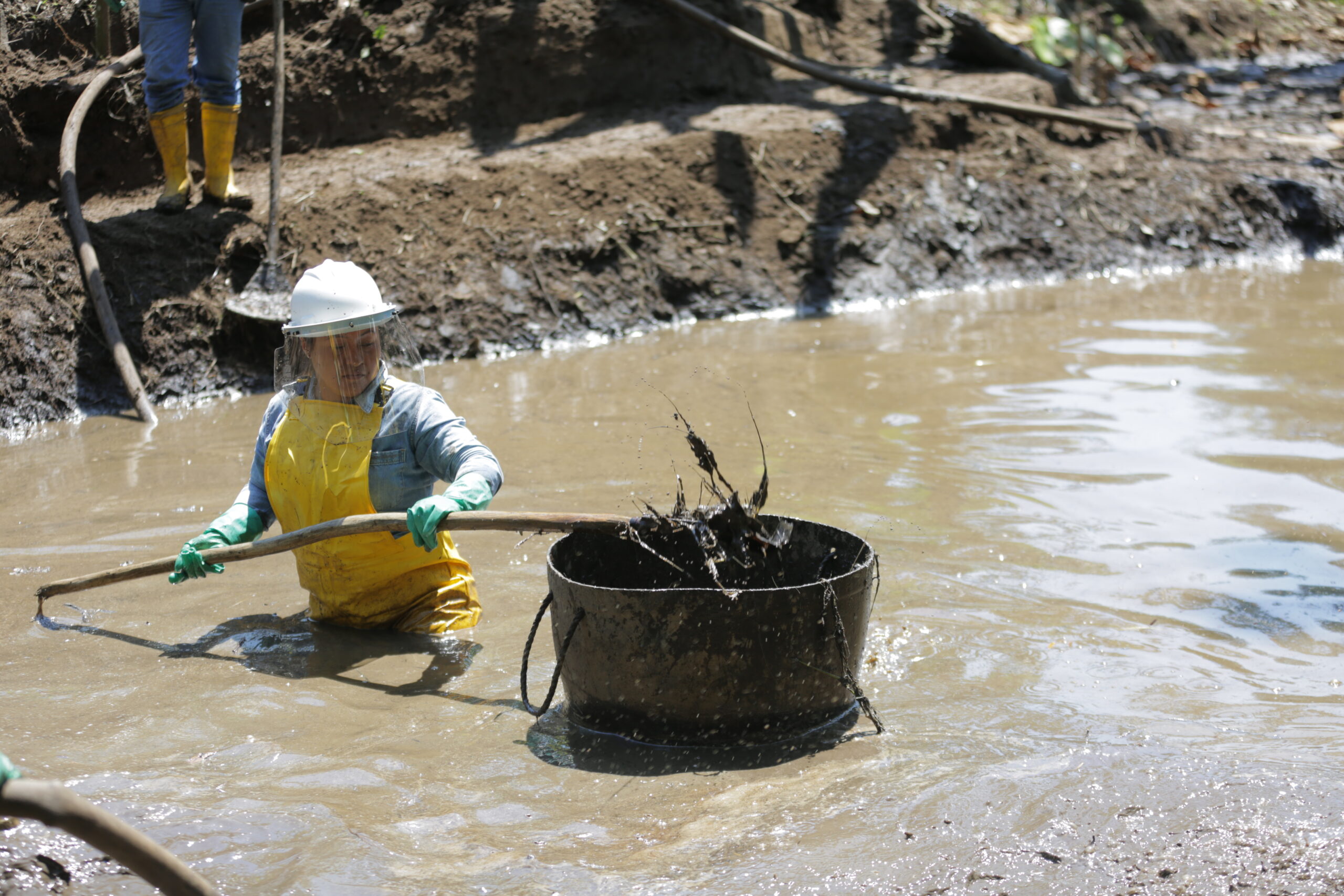 Personal técnico y operativo del programa realiza labores de limpieza que contemplan la separación de residuos de hidrocarburo y material orgánico. Posteriormente, recupera y procesa el crudo existente en fuentes de contaminación, a través de la Planta de Tratamiento y Recuperación de Sacha, Orellana, con el fin de incorporarlo nuevamente a la producción nacional.