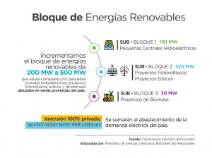 Ecuador impulsa el desarrollo de proyectos de generación eléctrica, principalmente de fuentes limpias. Como parte de esta gestión, el Bloque de Energías Renovables No Convencionales (ERNC), que busca desarrollar pequeñas centrales hidroeléctricas, proyectos fotovoltaicos, eólicos y de biomasa en varias provincias del país, fue actualizado de 200 MW a 500 MW de potencia.