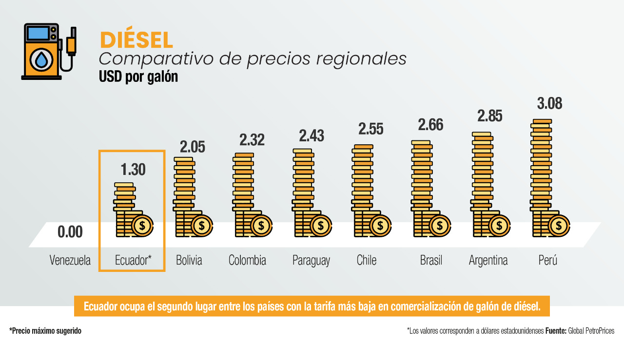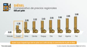 Ecuador ocupa el segundo lugar entre los países con precios de comercialización de gasolina extra y Ecopaís, así como de Diésel 2 y Diésel Premium más bajos a comparación de ocho países de la Región. Solo Venezuela tiene costos inferiores.