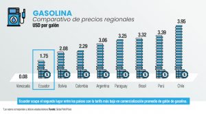 Con estos valores, según Global Petro Prices, Ecuador se ubica en el segundo lugar con los precios más bajos de comercialización de gasolina extra y Ecopaís, así como de Diésel 2 y Diésel Premium a comparación de Bolivia, Colombia, Argentina, Paraguay, Brasil, Perú, Chile. Solo Venezuela tiene un costo inferior al de Ecuador debido a diversas condiciones de este país. (ver infografías).