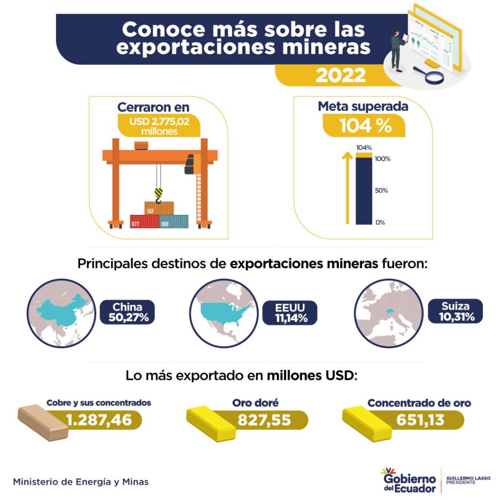 Las exportaciones de productos mineros en el 2022 cerraron con USD 2.775,02 millones, según los datos del Banco Central del Ecuador, lo que representa 32,64% superior a lo exportado en el mismo periodo del 2021.