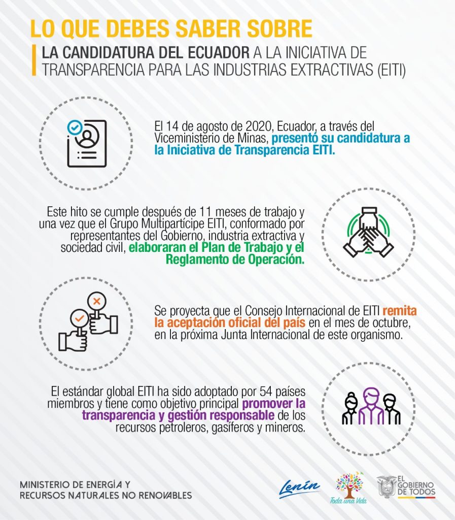 Este 14 de agosto de 2020, Ecuador, a través del Viceministerio de Minas del Ministerio de Energía y Recursos Naturales No Renovables (MERNNR), presentó formalmente la candidatura del país para concretar su adhesión a la Iniciativa de Transparencia para las Industrias Extractivas (EITI, por sus siglas en inglés). Se estima que el Consejo Internacional de este organismo remita la aceptación oficial del país, en el mes de octubre durante la próxima Junta Internacional de EITI.