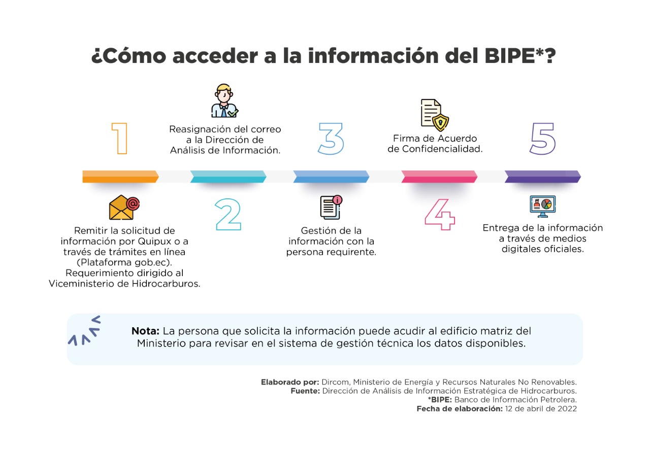 Como parte de las políticas petroleras establecidas por el Gobierno Nacional, a través del Decreto Ejecutivo Nro. 95, y en cumplimiento a lo contemplado en la Ley Orgánica de Transparencia y Acceso a la Información Pública (LOTAIP); el Ministerio de Energía y Recursos Naturales No Renovables, mediante la Dirección de Análisis de información Estratégica de Hidrocarburos, implementa la herramienta virtual “Banco de Información Petrolera del Ecuador (BIPE)”, la cual contiene aproximadamente 74 000 documentos y registros relacionados a la actividad de los hidrocarburos en el país.