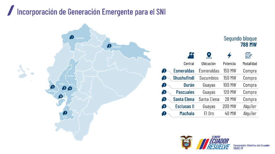 El Gobierno Nacional, a través del Ministerio de Energía y Minas y de la Corporación Eléctrica del Ecuador – CELEC EP, se propone incorporar 788 megavatios de potencia adicionales, que permitirán afrontar la emergencia energética y abastecer de energía eléctrica al país durante los periodos de estiaje, cuando disminuye la producción hidroeléctrica.