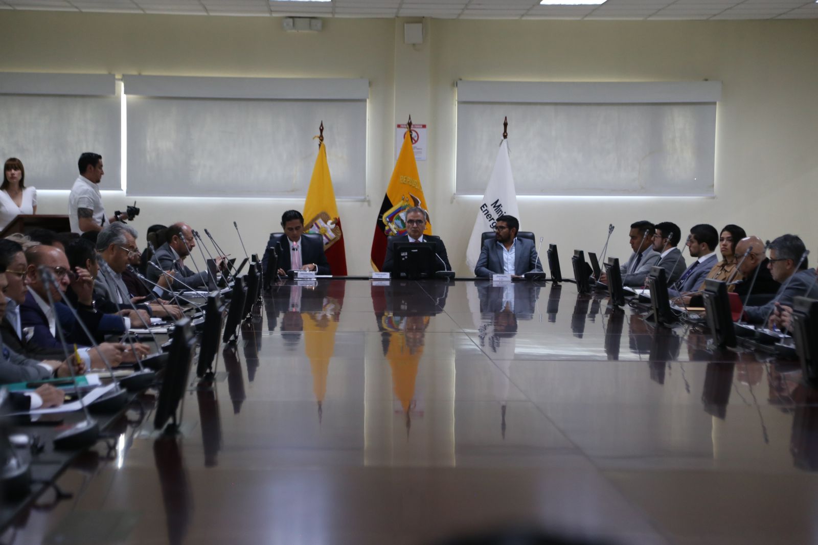 En un acto desarrollado hoy, en Quito, en la Sala de Crisis del Servicio Integrado de Seguridad ECU 911, el ministro de Energía y Minas, Antonio Goncalves; junto al viceministro de Electricidad y Energías Renovables, Rafael Quintero; y al Gerente General de CELEC EP, Fabián Calero, mantuvieron un conversatorio con representantes de empresas interesadas en participar en los nuevos procesos, en el cual se socializaron los detalles técnicos y absolvieron inquietudes.