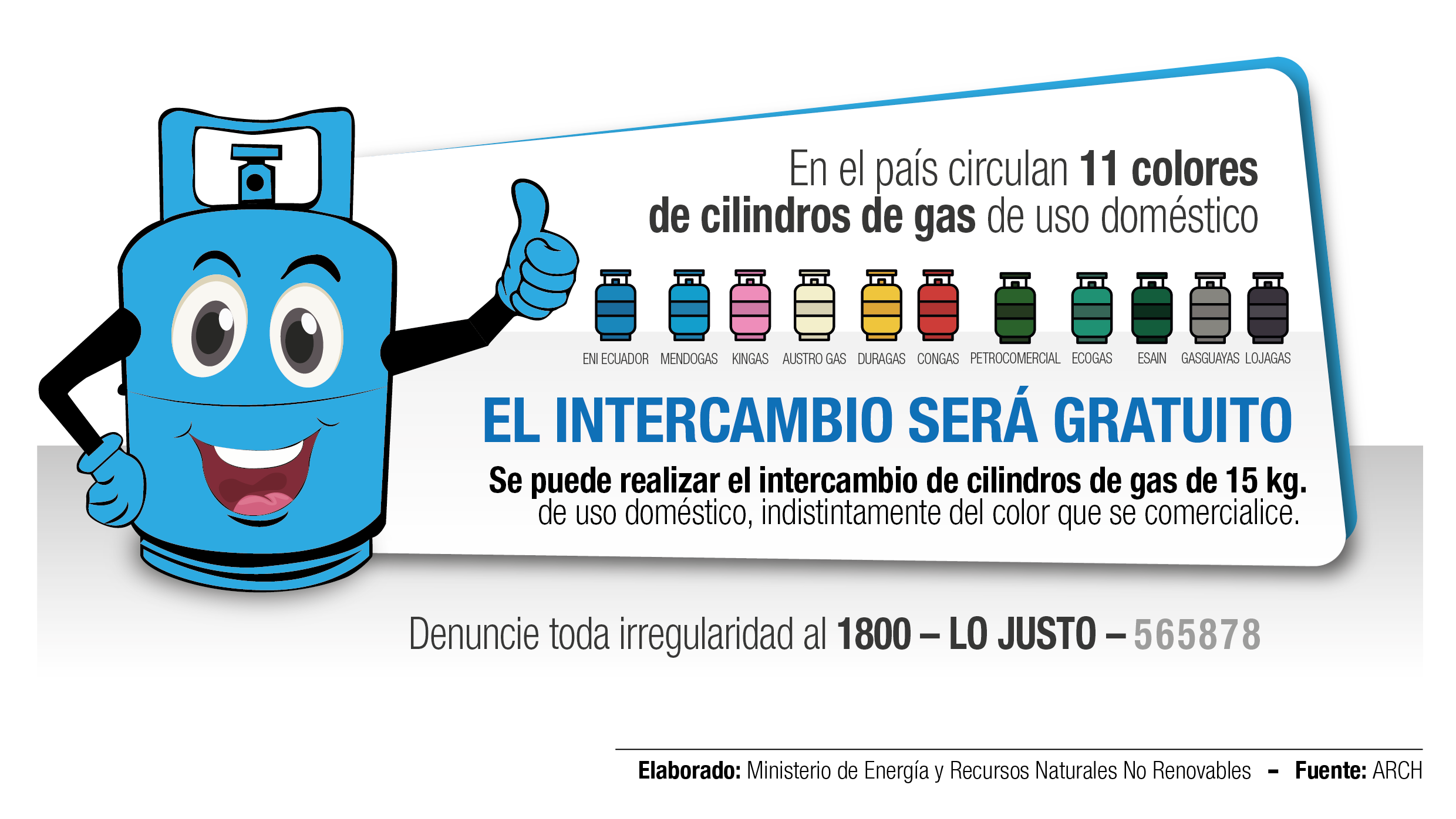 El Gobierno Nacional, a través de la Agencia de Regulación y Control Hidrocarburífero (ARCH) recuerda a la ciudadanía, que a escala nacional, se puede realizar el intercambio gratuito de cilindros de gas de uso doméstico, indistintamente del color que se comercialice, de acuerdo a lo que establece el Reglamento de Actividades de Comercialización de Gas Licuado de Petróleo (GLP), Suplemento Número 621, del 5 de noviembre de 2015.