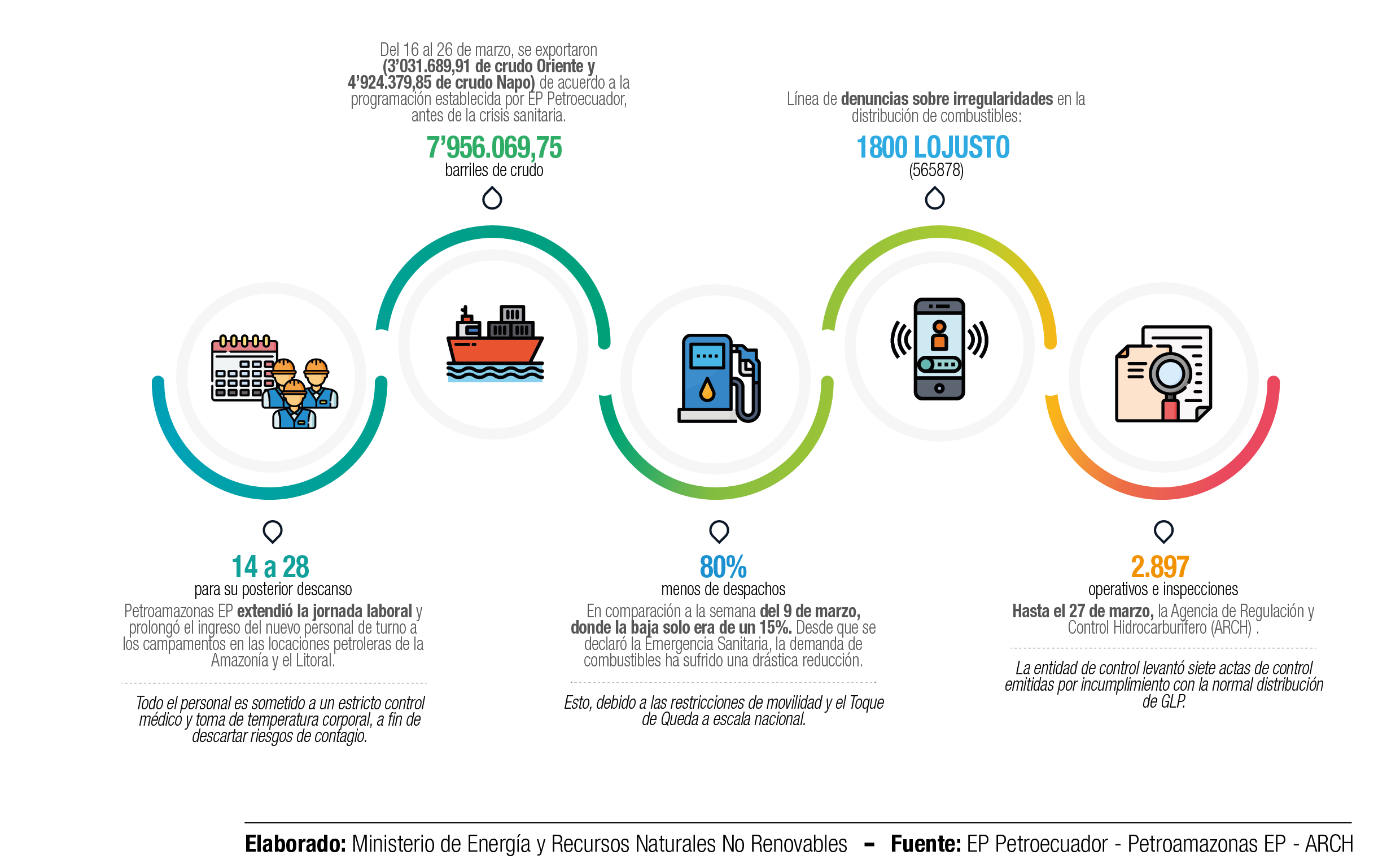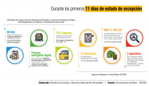 Tras la vigencia del Decreto Ejecutivo 1017, del 16 de marzo de 2020, respecto a la declaratoria de “Estado de Excepción por calamidad pública en todo el territorio nacional, por los casos de coronavirus confirmados”, el Ministerio de Energía y Recursos Naturales No Renovables conjuntamente con sus entidades adscritas ha garantizado, durante estos primeros 11 días, los servicios, labores y operaciones en los sectores: eléctrico, hidrocarburífero y minero, considerados estratégicos para el país.
