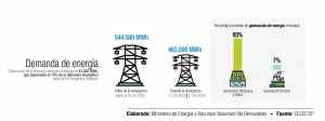 La demanda de energía, incluida la demanda de unidades de negocio, grandes consumidores y consumos propios, ha disminuido, por ejemplo, en la semana del 16 al 22 de marzo se registró una disminución de la demanda de energía del 10,90%, a escala nacional, en comparación con la semana del 9 al 15 de marzo. En el caso del 23 al 26 de marzo se registró una disminución de la demanda de energía del 10,43%, comparada con la semana anterior. Así también, se evidenció una disminución promedio, durante el fin semana, en un 11%.