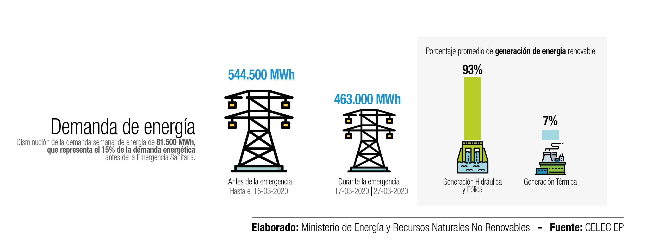 En lo que respecta a la demanda semanal de energía en generación, según datos de CELEC EP, bajó de 544.500 MWh a 463.000 MWh, que representa el 15% menos, de lo reportado antes de la Emergencia Sanitaria.