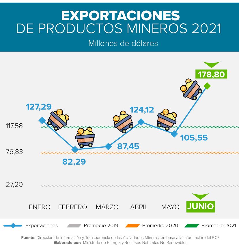 Según informes del Banco Central del Ecuador (BCE), en junio de 2021 se alcanzó el nivel de exportación mensual más elevado de la historia minera del país, alcanzando un valor de USD 178,80 millones.